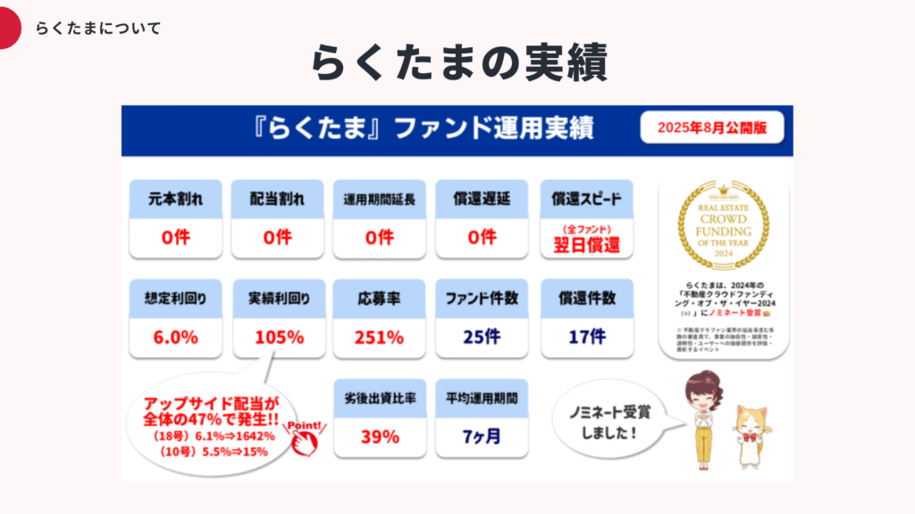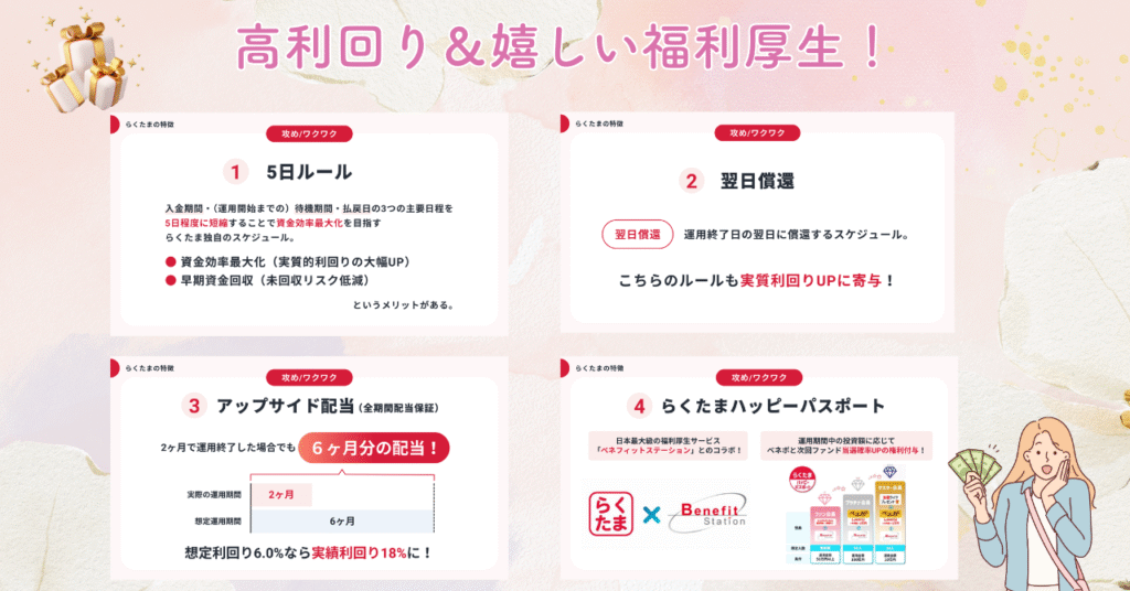 らくたま5.5〜6.5%平均6か月優待・ポイント制度、翌日償還実績、投資家保護ルール