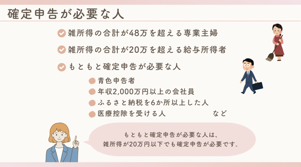 雑所得の年間合計が20万円以上の人や年収2,000万円以上の会社員など、
